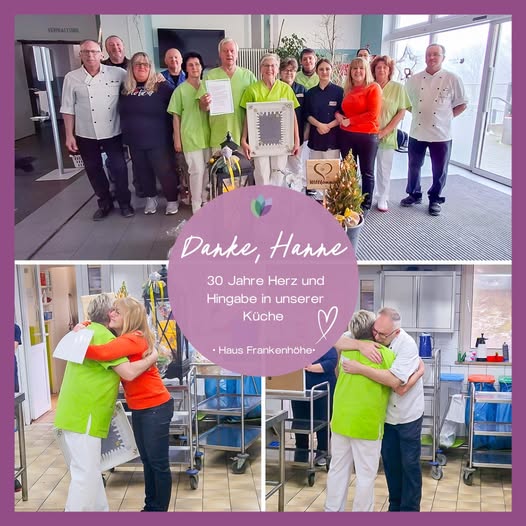 Hanne war mehr als eine Küchenmitarbeiterin – sie war die Seele unserer Küche: immer gut gelaunt, immer hilfsbereit und gefühlt für drei gleichzeitig im Einsatz. Mit ihrer Ruhe, ihrem Humor und ihrem großen Herzen hat sie unseren Alltag über Jahrzehnte bereichert.