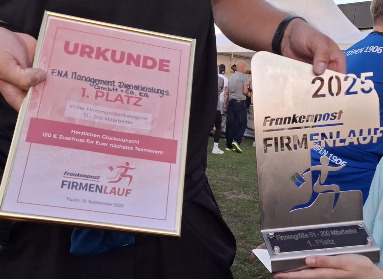 Beim diesjährigen Firmenlauf durfte unsere Einrichtung Grund zur Freude haben: Die FNA Management Dienstleistungs GmbH, ein Teil unserer Unternehmensgruppe, hat den 1. Platz belegt – und das dank der zahlreichsten Teilnehmergruppe!